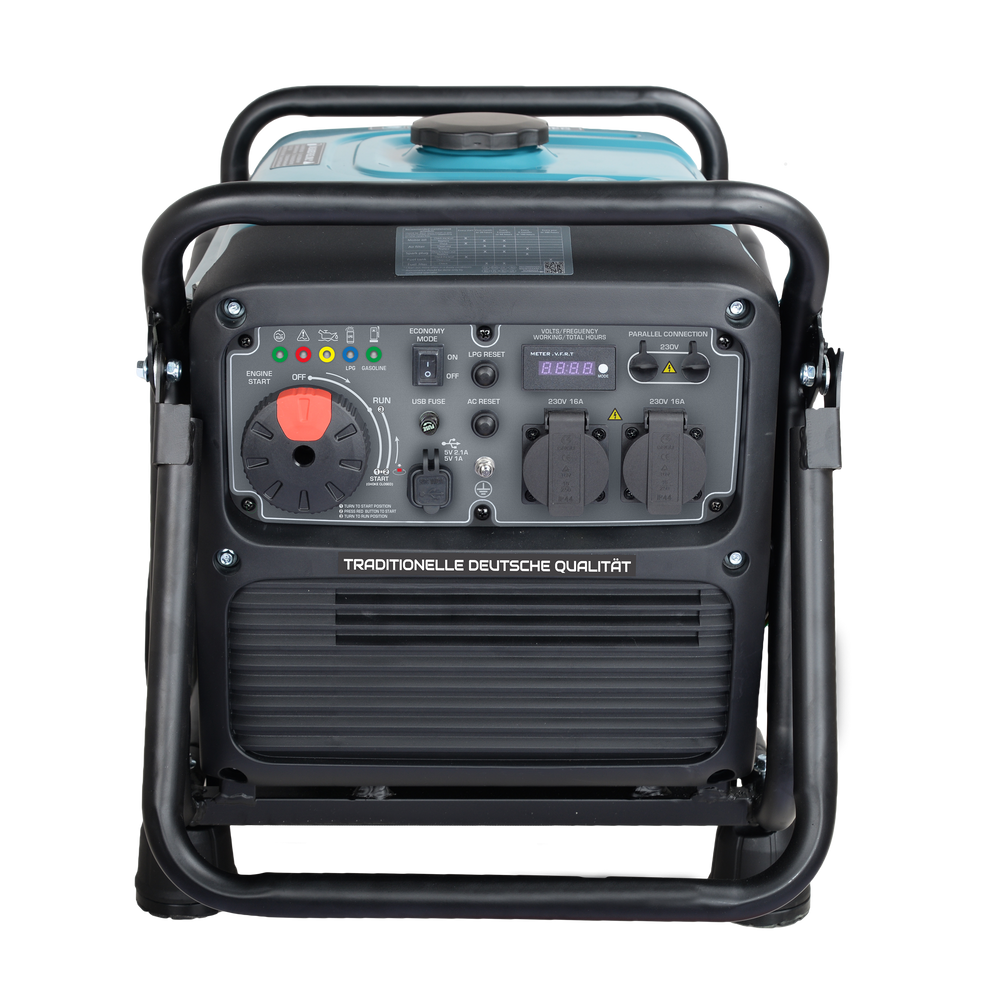 Minden funkció kényelmes elhelyezése: multifunkcionális LED kijelző (üzemóra számláló, frekvencia, feszültség), üzemmód jelző, túlterhelés és rövidzárlat védelem, alacsony olajszint érzékelő, Visszaállítás gomb a vezérlőrendszer visszaállításához és a feszültségellátás helyreállításához, csatlakozó generátorok párhuzamos összekapcsolásához, két USB kimenet (5V/1A, 5V/2.1A) széles körű eszközökhöz, 230 V aljzatok és földelő csatlakozó.